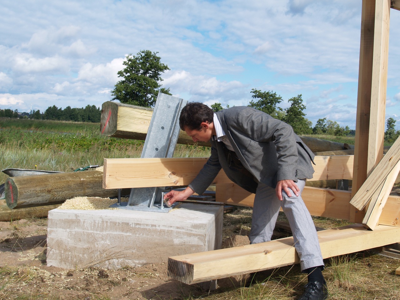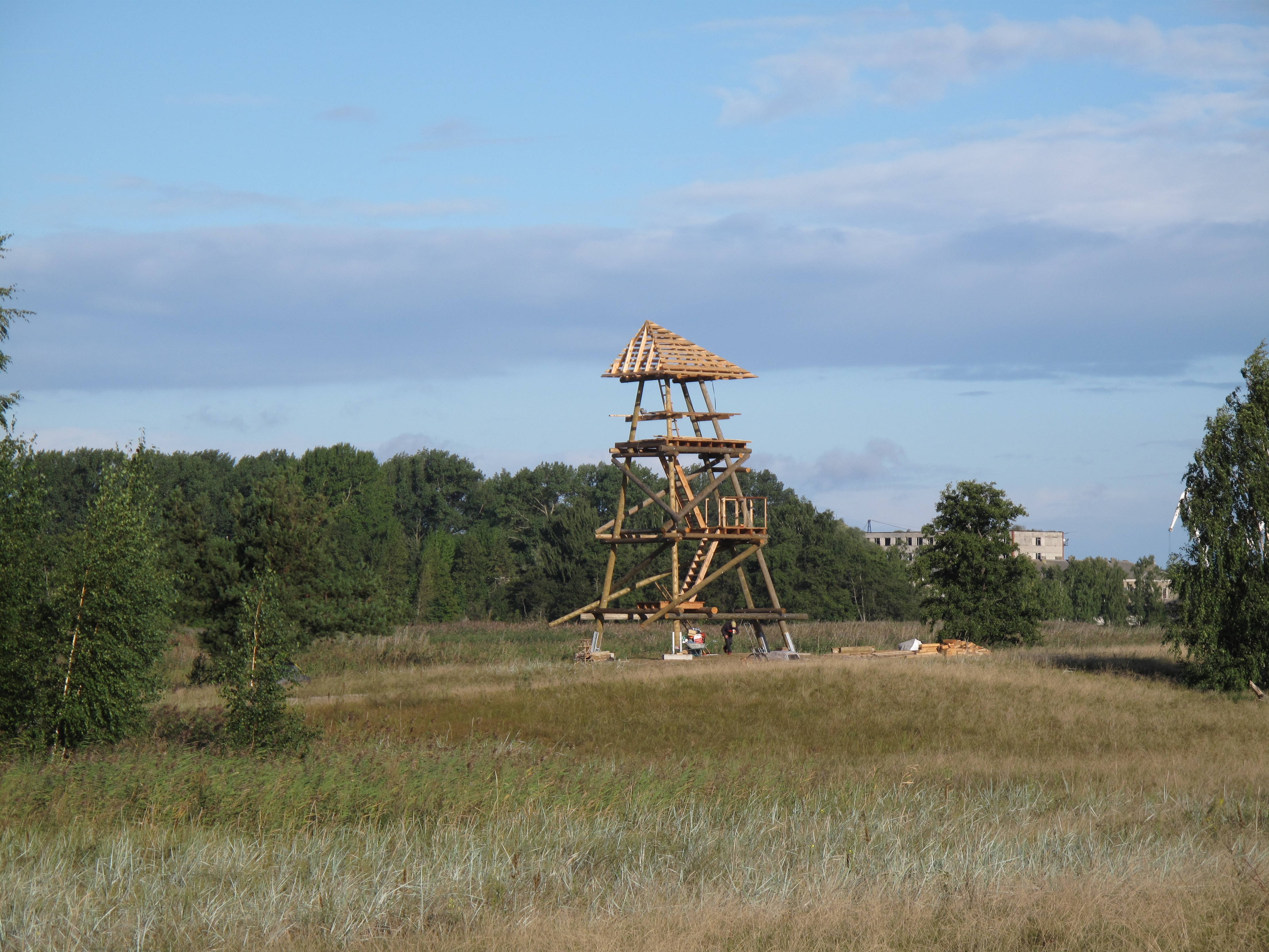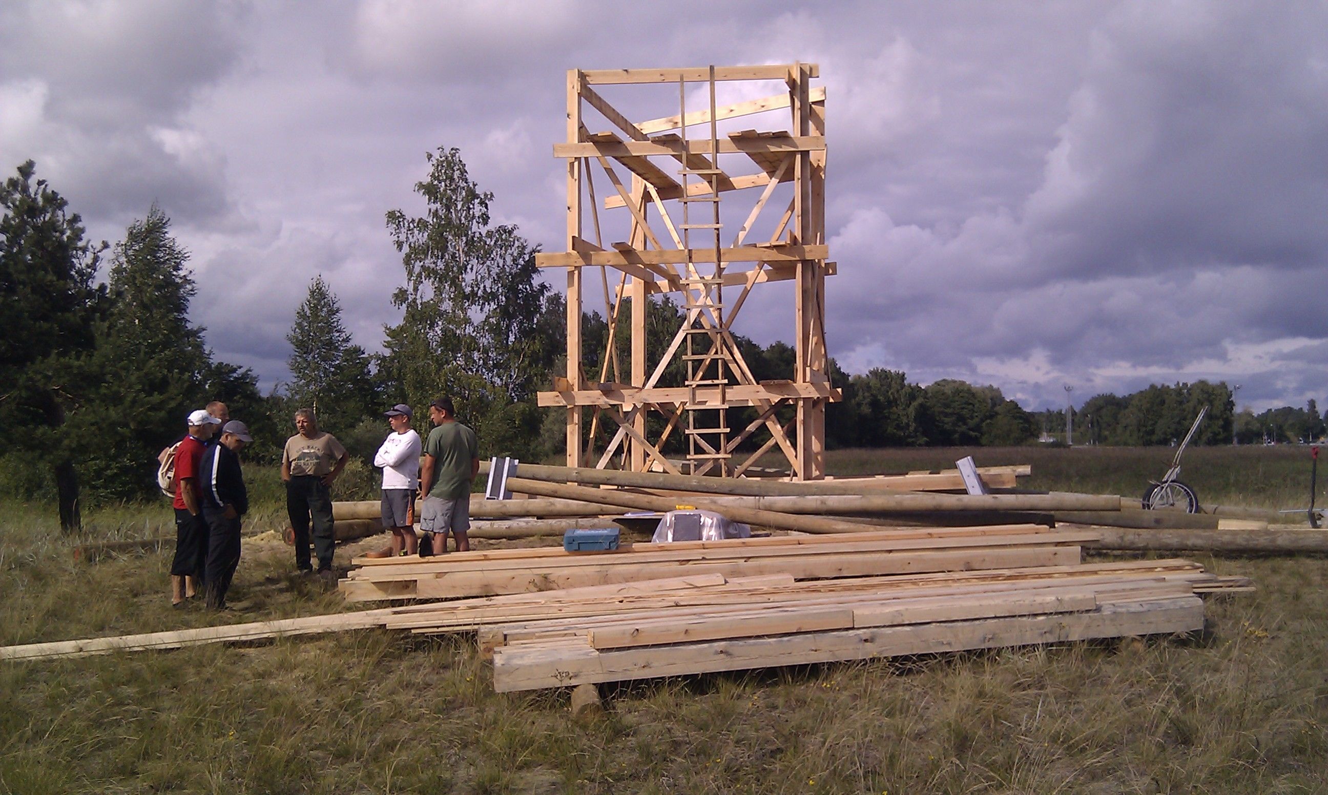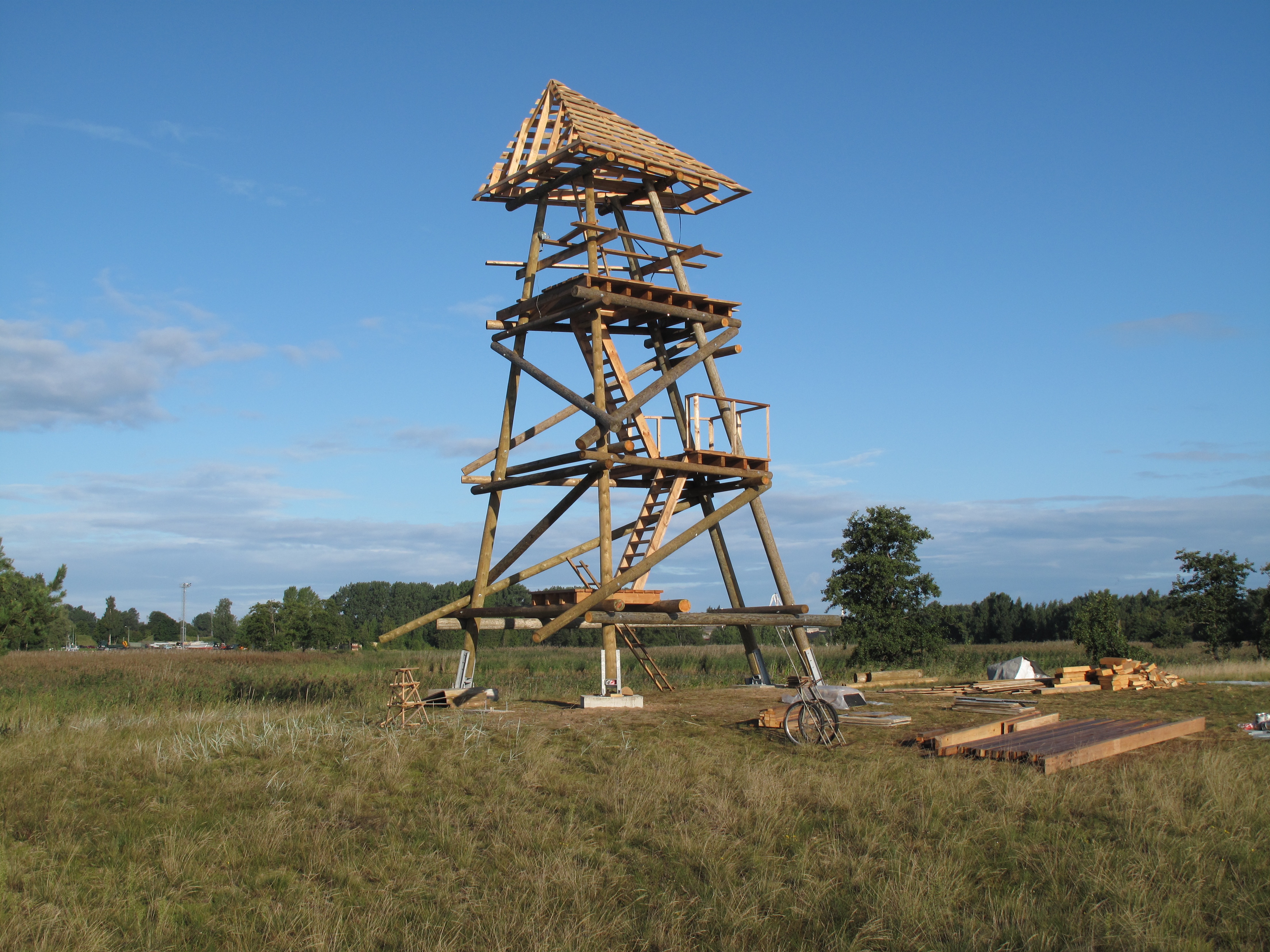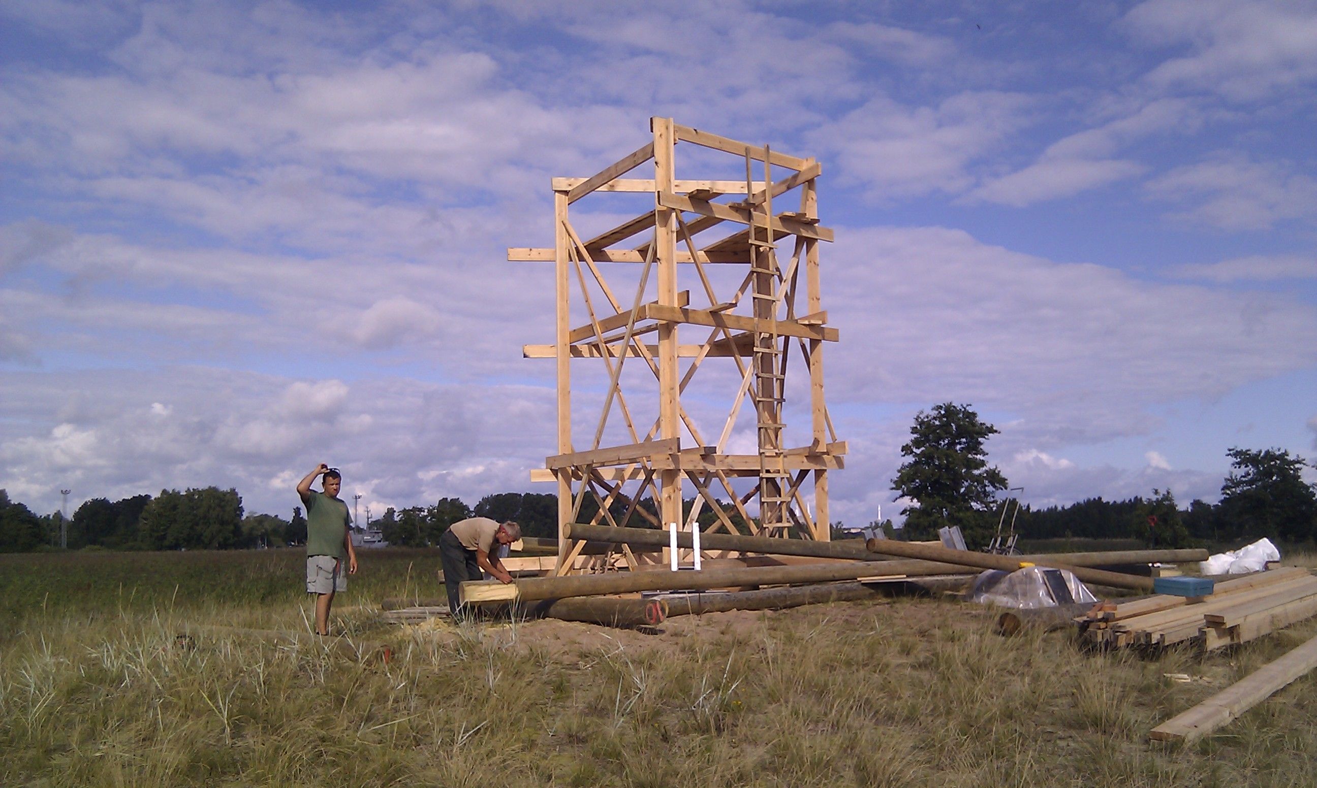 2011.gada Augusta sākumā tika ielikti tornim pamati un pludināti uz salu baļķi torņa karkasam un stalažām. 10.augustā jau bija uzslietas stalažas un teju jau slieti karkasa baļķi. Augusta vidū plānots iebetonēt kāpņu pamatakmeni un tajā ievietot kapsulu.